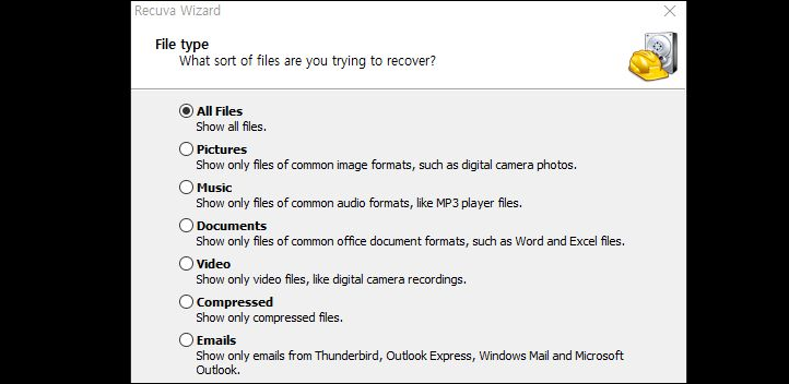 실행하면 Recuva Wizard가 실행이 됩니다.