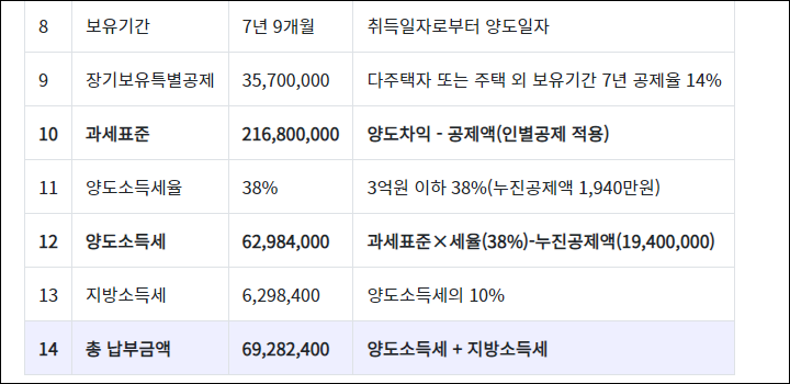 그러면 아래에 계산된 양도세 결과를 확인할 수 있습니다. 양도소득세율 및 장기보유특별공제 등의 정보를 토대로 총 납부 금액을 확인할 수 있습니다.