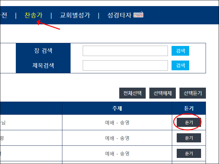 GOOD TV에서는 찬송가를 들을 수 있습니다. 찬송가 메뉴로 이동한 후 듣고자 하는 찬송가 옆에 듣기 버튼을 클릭하면 해당 찬송가를 들을 수 있습니다.