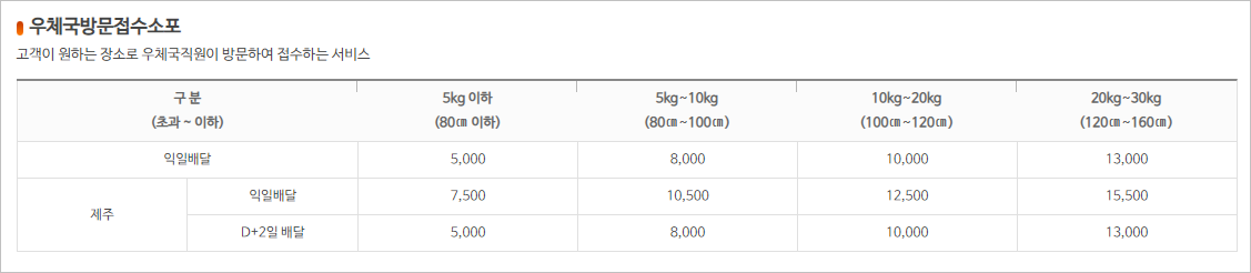 ▼ 집으로 직접 우체국에서 방문하여 배송하는 택배의 경우는 무게에 따라 아래와 같은 비용이 발생합니다.