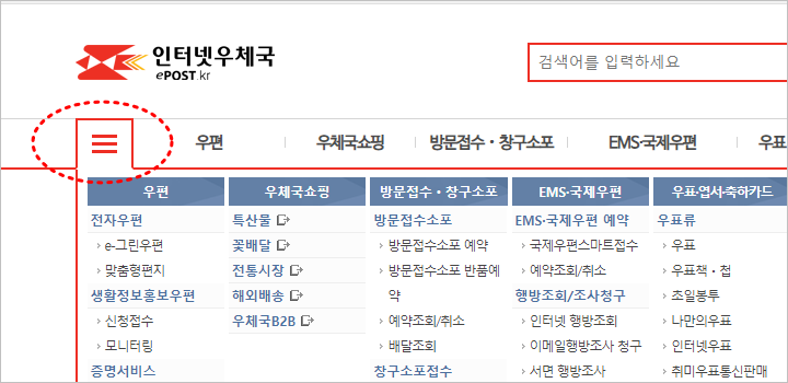 ▼ 인터넷 우체국 홈페이지에 접속하여 좌측 상단 줄 세개 메뉴를 누릅니다.