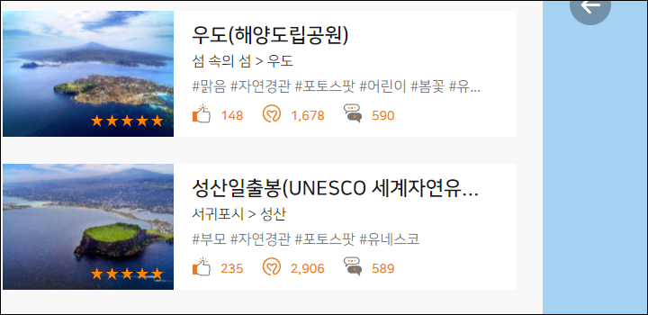 관광지 리스트를 확인할 수 있으며 추천도 등을 확인할 수 있습니다.